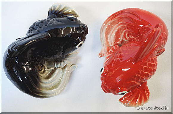 信楽焼赤い金魚と黒い金魚縁起置物