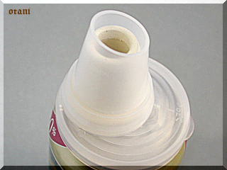 | ●缶ビールに注ぎ口をはめるだけ | ●特殊陶器製注ぎ口とキャップの裏側 |