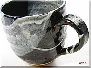 天目白流マグカップ 【信楽焼コーヒーカップ】 このコーヒーカップの黒色は無心になる、意識しない、 深く考えない、そんな意味をも込めています。 信楽焼の土味素材を生かし、まったりした黒色(天目) をコーヒーカップに掛け、手業のロクロ目が灯りで 陰影を醸し出しています。 自然な流れ具合の白流色が伸びやかに気ままに 自由に、このコーヒーカップに流れています。 |