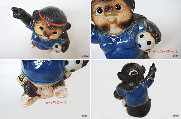 笑顔が素敵な女子サッカー狸縁起置物です。